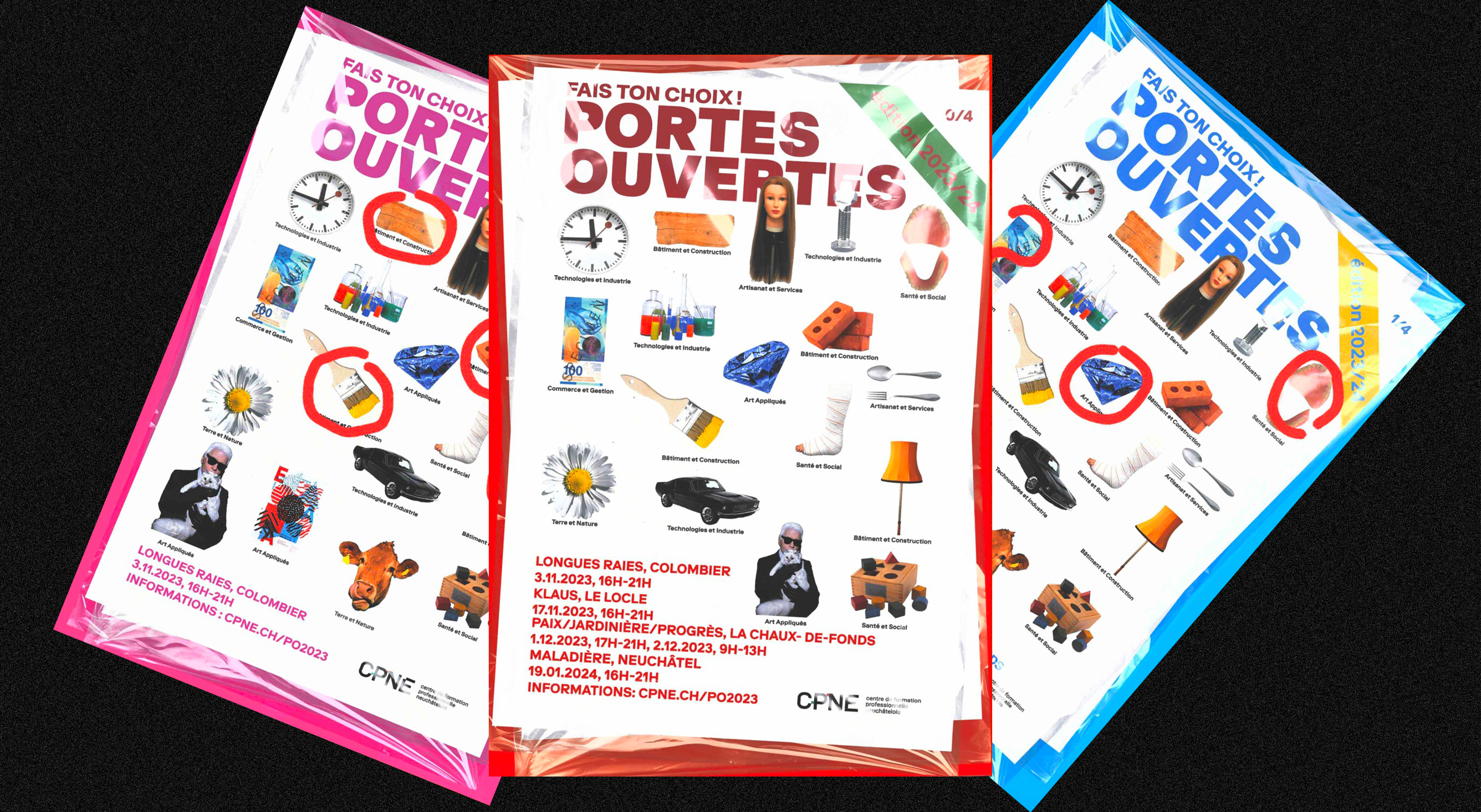 The open house poster for CPNE 2023 was a competition in which I participated by submitting a dynamic and original design. My goal was to engage the target audience, specifically young people finishing mandatory school and thinking to their next step. To achieve this, I decided to create profession-specific magazines featuring the diversity of course offers. Each magazine showcased location specific information on the different training options available and provided details on the person to contact for specific careers paths.